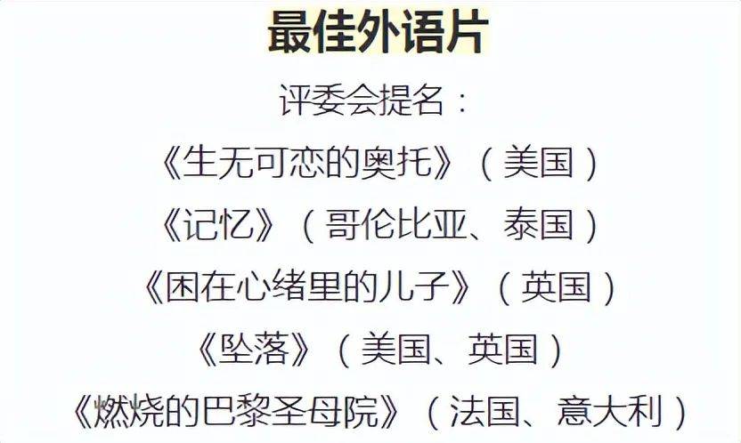 1、最佳外语片提名:《生无可恋的奥托》(美国)、《记忆》(哥伦比亚、泰国)、《困在心绪里的儿子》(英国)、《坠落》(美国、英国)、《燃烧的巴黎圣母院》(法国、意大利)