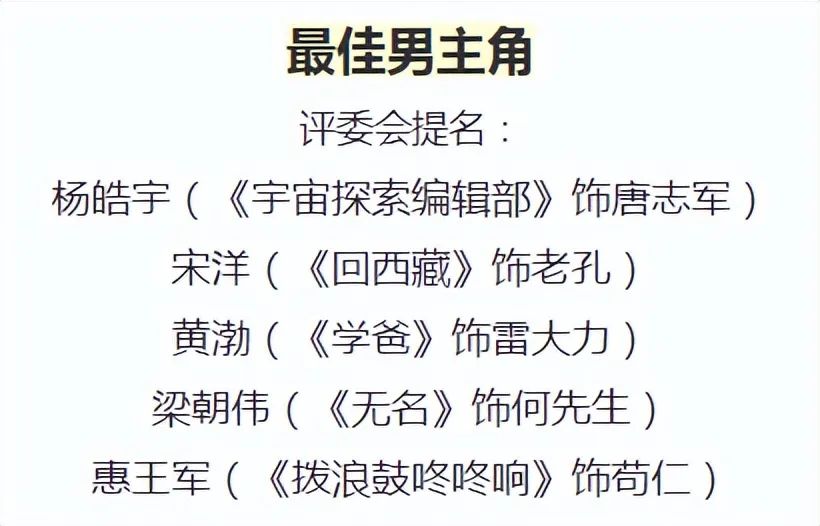 3、最佳男主角提名:杨皓宇(《宇宙探索编辑部》饰唐志军)、宋洋(《回西藏》饰老孔)、黄渤(《学爸》饰雷大力)、梁朝伟(《无名》饰何先生)、惠王军(《拨浪鼓咚咚响》饰苟仁)