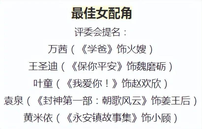 6、最佳女配角提名:万茜(《学爸》饰火嫂)、王圣迪(《保你平安》饰魏磨砺)、叶童(《我爱你!》饰赵欢欣)、袁泉(《封神第一部:朝歌风云》饰姜王后)、黄米依(《永安镇故事集》饰小顾)