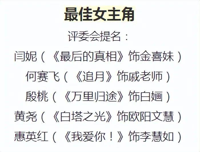 4、最佳女主角提名:闫妮(《最后的真相》饰金喜妹)、何赛飞(《追月》饰戚老师)、殷桃(《万里归途》饰白婳)、黄尧(《白塔之光》饰欧阳文慧)、惠英红(《我爱你!》饰李慧如)