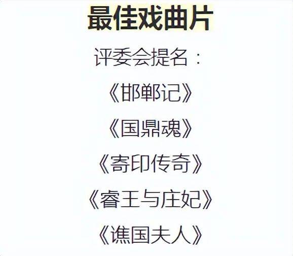 6、最佳戏曲片提名:《邯郸记》、《国鼎魂》、《寄印传奇》、《睿王与庄妃》、《谯国夫人》