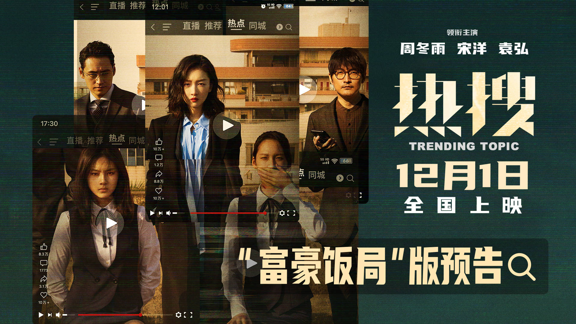 原标题:电影《热搜》曝“富豪饭局”版预告 周冬雨宋洋袁弘展开网络舆论对抗