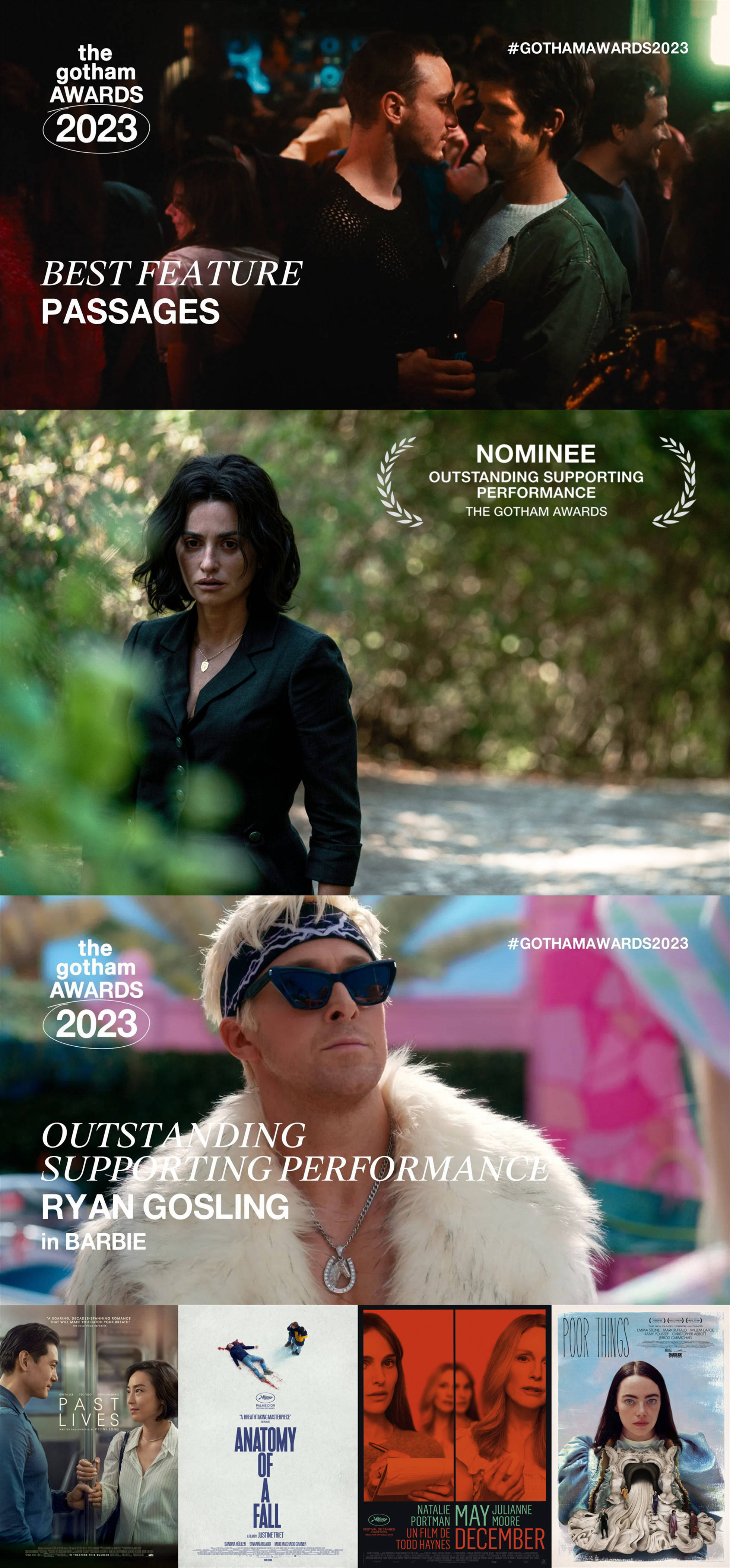搜狐娱乐讯 2023美国独立电影“哥谭奖”公布提名,奇幻同志题材影片《我们都是陌生人》四项提名领跑,《过往人生》《利益区域》《坠落的剖析》等高口碑影片角逐最佳影片/最佳国际影片;格蕾塔·李、朱丽叶·比诺什、瑞恩·高斯林、佩内洛普·克鲁兹、米歇尔·威廉姆斯、卡莉·史派妮等竞逐演技奖。本届哥谭奖将于11月27日颁奖。电影类完整名单↓↓