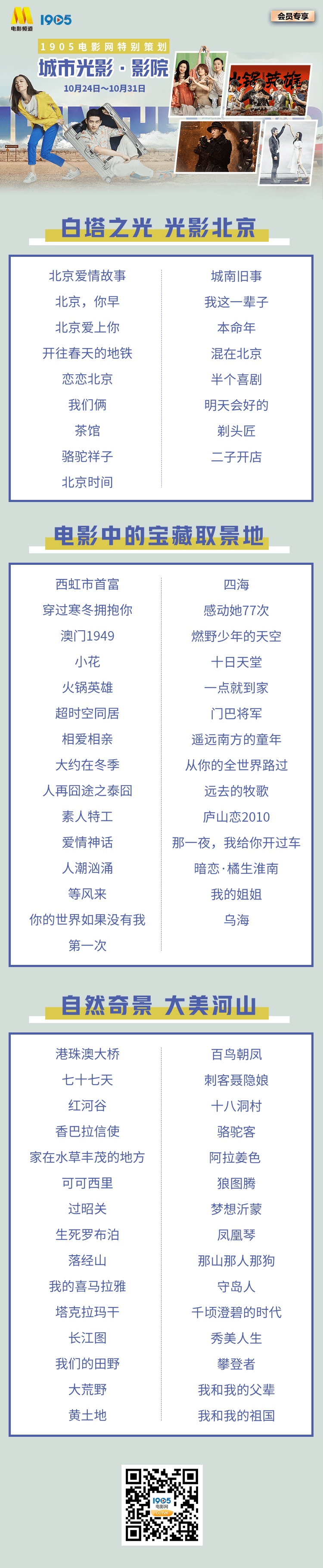 都说“一部戏带火一座城”,10月24日中午15:00起,1905电影网特别策划了“城市光影·影院”独播剧场,让电影中的宝藏取景地藏不住!“城市光影·影院”集结多部城市光影佳作,为你带来足不出户沉浸式城市观影体验,看遍光影中的世间万千!