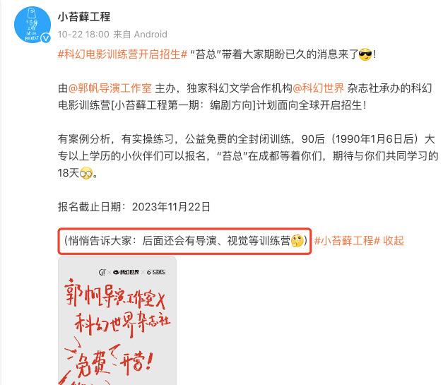 第二则是由刘慈欣担任总顾问,郭帆为号召人,王红卫主理,发起科幻电影训练营“小苔藓工程”,和一群热爱科幻电影的人,一起开启属于科幻电影的冒险。