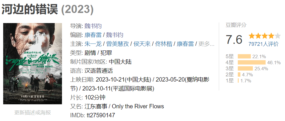 在豆瓣平台,《河边的错误》开分拿到了7.7分,而最新评分则为7.6分,四星好评占比最高,约为46%。
