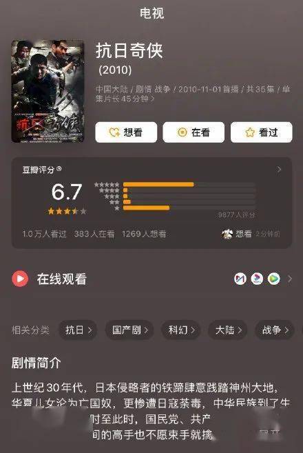 其中一个是11年前播映的带有“手撕鬼子”等奇葩剧情的二战抗日电视剧《抗日奇侠》,本片在豆瓣电影最初为3.4分,在两日内,大量用户为本片打出满分5星好评,导致本片评分一度飙升至6.7分,接近翻一番。