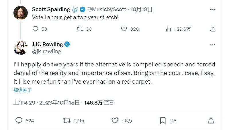 针对英国工党提议让那些针对跨性别群体的欺凌与暴力行为最高可被判处两年的监禁的言论。《哈利·波特》系列小说作者者J·K·罗琳表示,相比被迫发表罔顾事实的言论,她更愿意去做两年牢。
