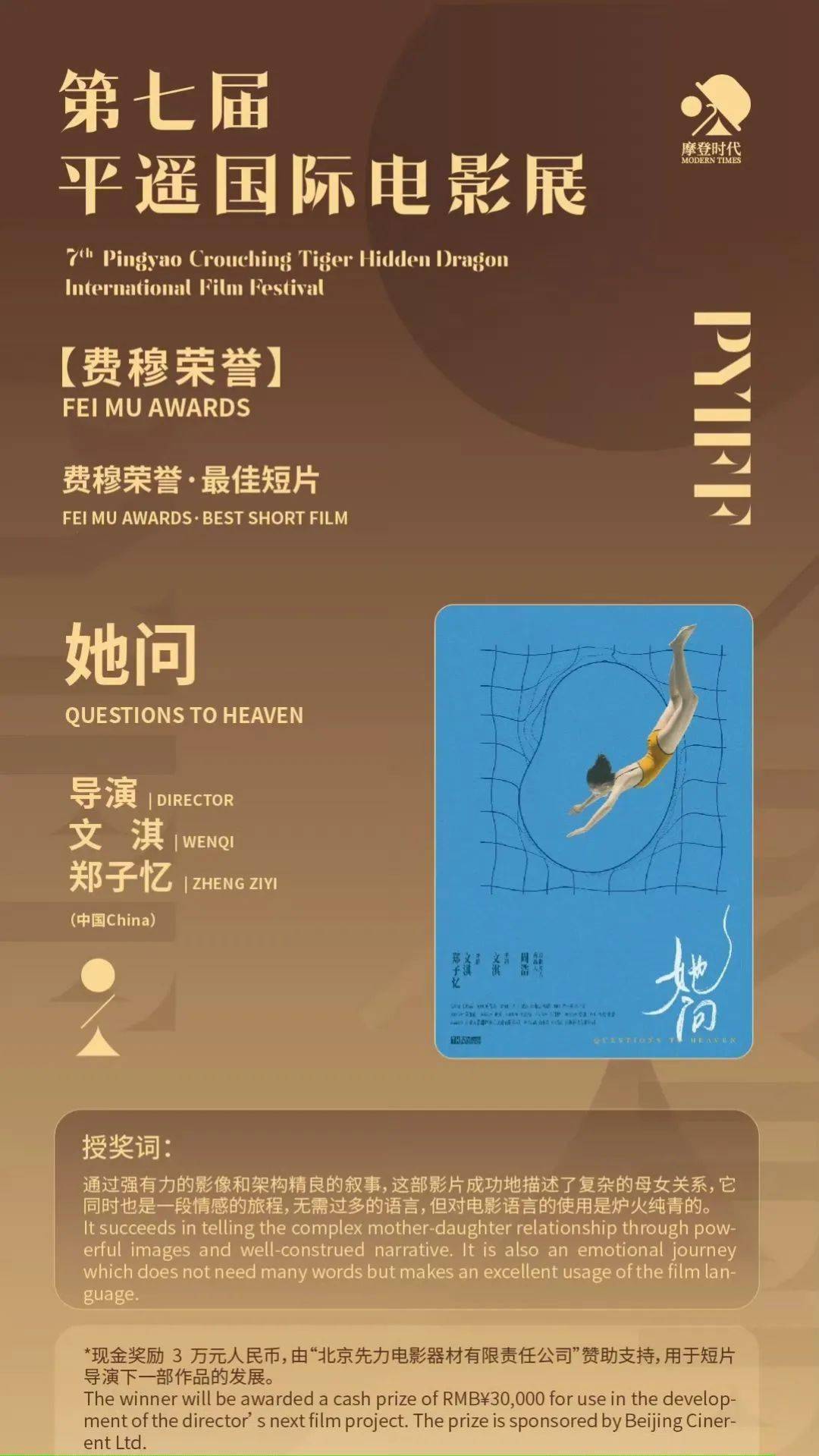 在这次电影展上还有一个熟悉的身影,凭借《嘉年华》到《血观音》被观众熟知的青年演员文淇,而此次她从演员转型为导演,与郑子忆共同执导了短片《她问》,并在第七届平遥国际电影节上荣获“费穆荣誉·最佳短片”。