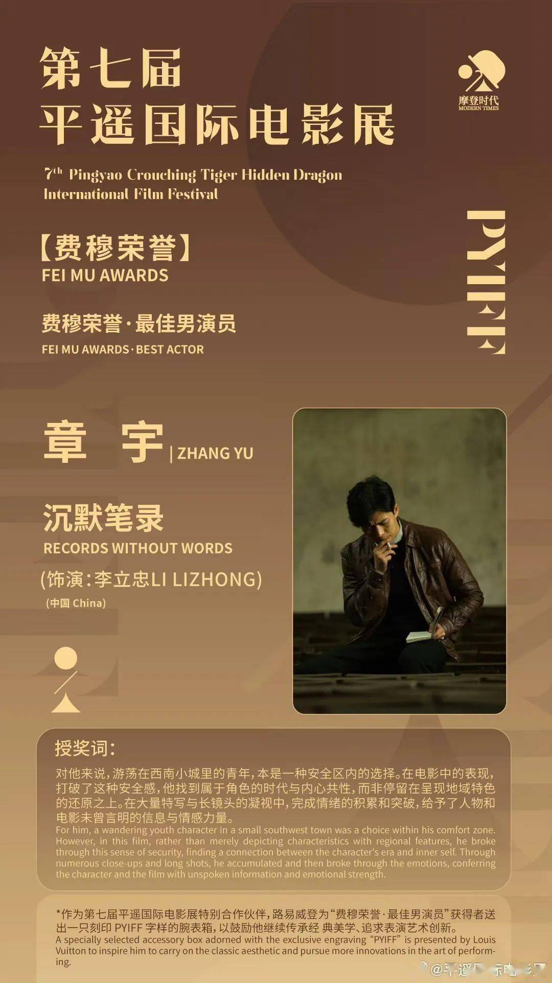 在第七届平遥国际电影展中,章宇凭借犯罪电影《沉默笔录》斩获“费穆荣誉·最佳男演员”,这也是他第一次拿到最佳男演员这一荣誉奖项。