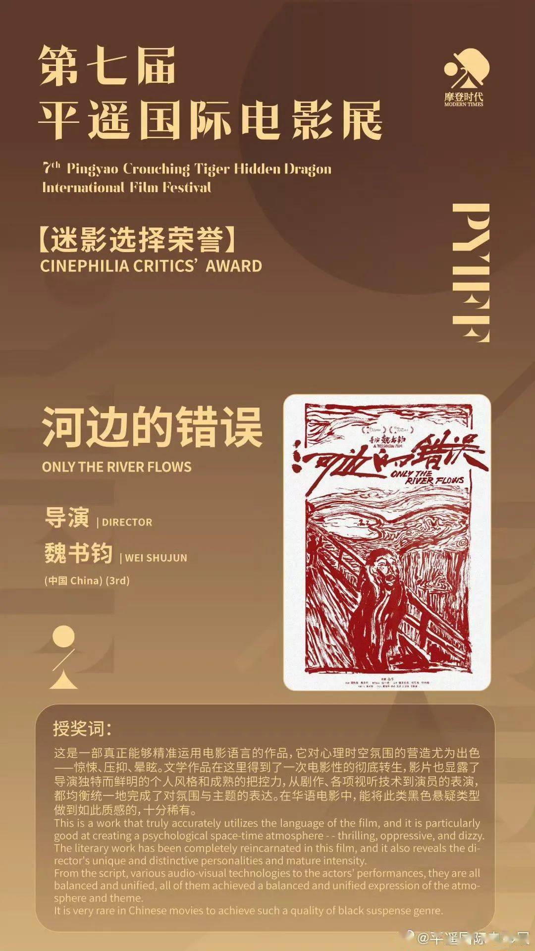 魏书钧执导的影片《河边的错误》在本届电影展荣获“费穆荣誉·最佳影片”,且同时获得了“迷影选择荣誉”。
