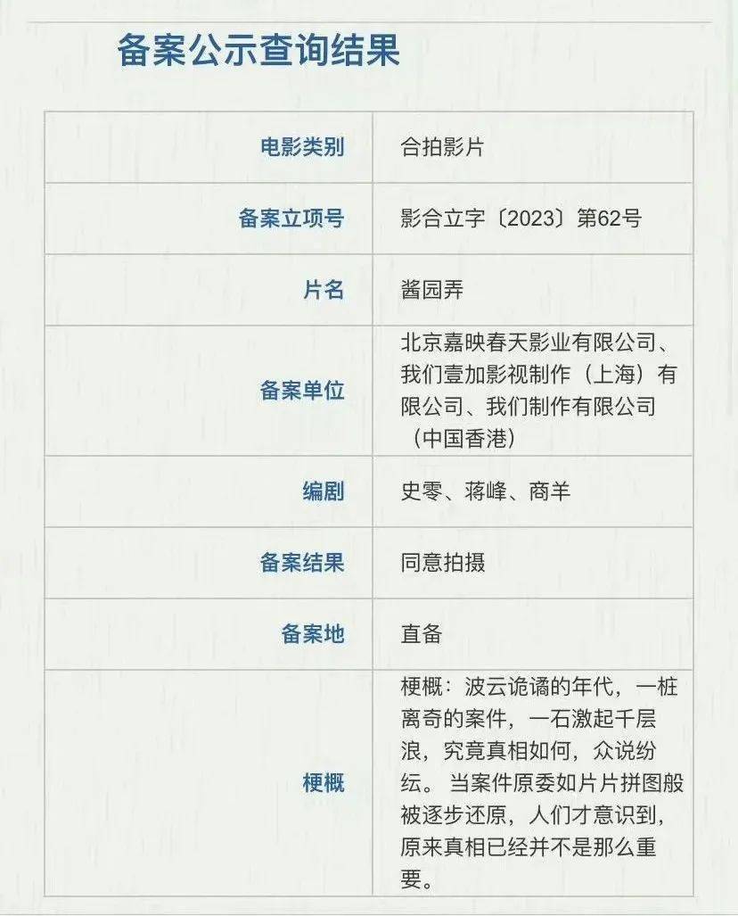 10月20日,导演陈可辛接受媒体群访透露,新片《酱园弄》将是一部十几个演员的群像戏,近期每天都在谈剧本、定演员,近十年来最忙的时候,将于下个月在上海开机。