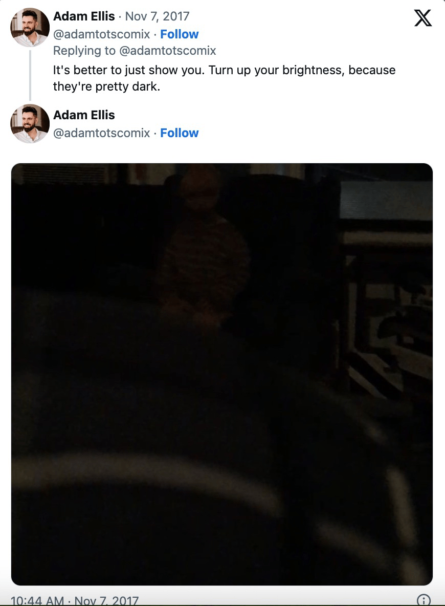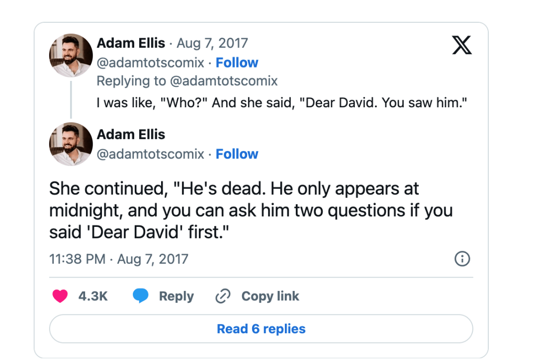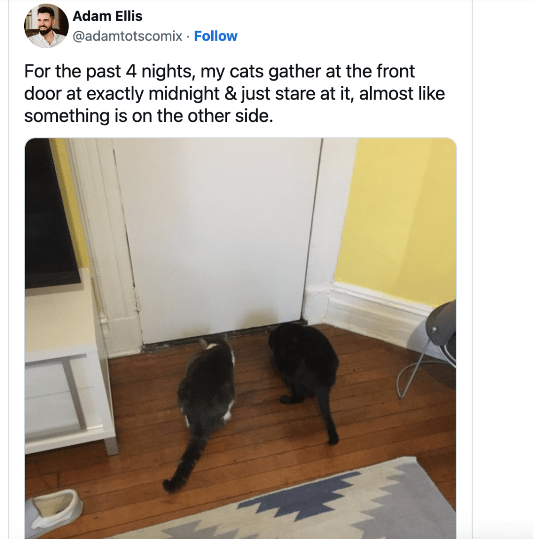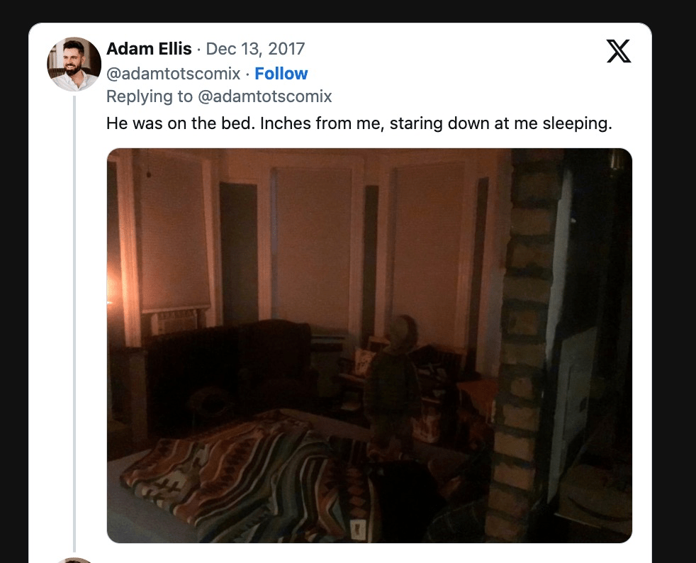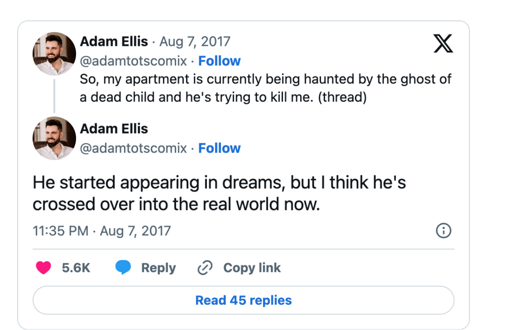 2017年8月7日的时候,Adam Ellis发推说,自己的公寓里有一个死去小孩子的幽灵,而且,想要杀他……
