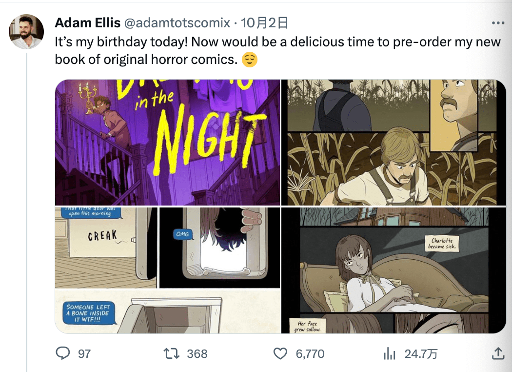 他现在也一直在正常更新着推特,人还是很健康,也很快乐。而他的恐怖漫画书也要出了,前些天他还在网上宣传呢。