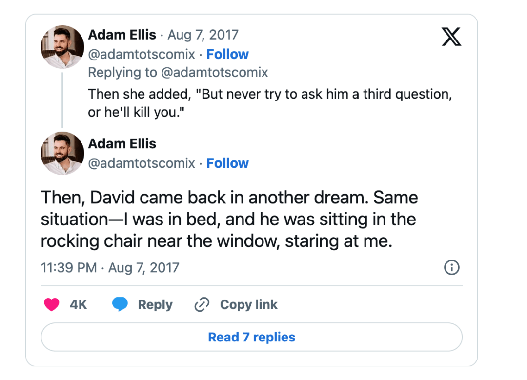 当然,这个故事还挺长的,那段时间,Adam Ellis每天都会在推上发布他的恶梦和撞鬼细节,非常细致,也非常刺激。