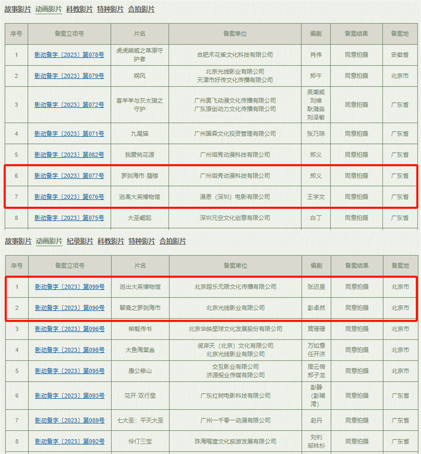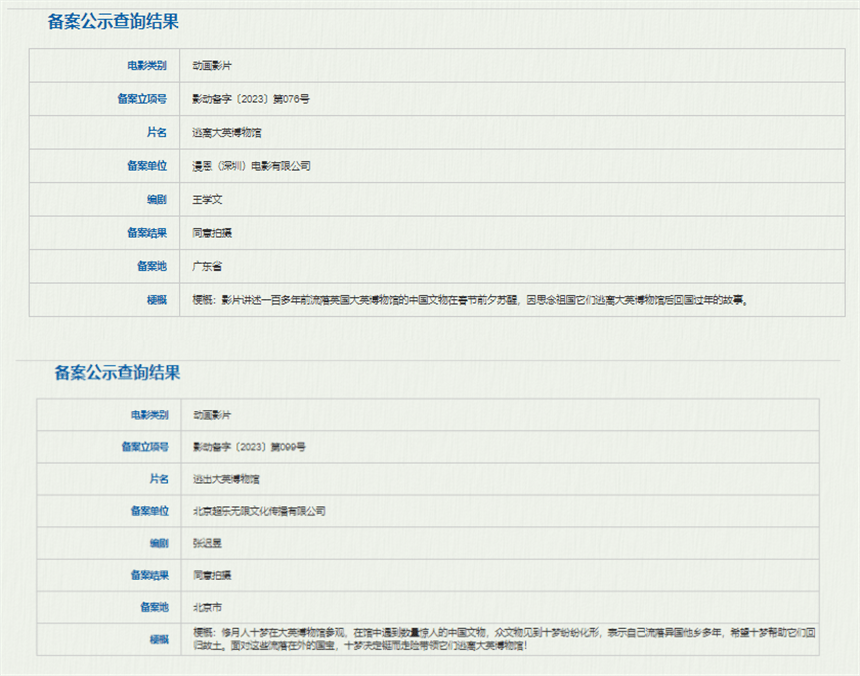 根据国家电影局9月15日、10月13日,分别发布的关于8月上、下全国电影剧本(梗概)备案、立项公示的通知显示,当月共有《逃离大英博物馆》、《逃出大英博物馆》两部相同题材动画电影通过备案。