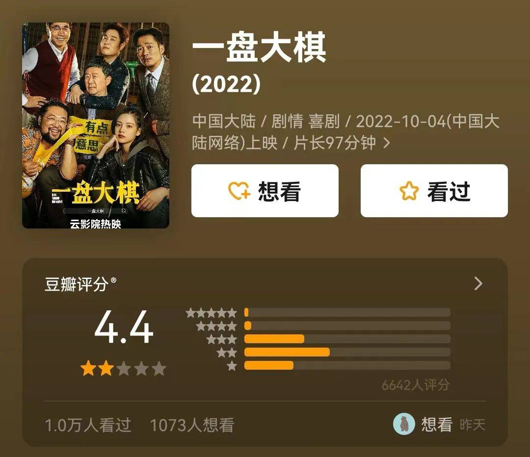 在2022年时,小沈阳终于找到了新的出路,这一年他参演了《请君》,在剧中担任配角,还首次出演网络电影《一盘大棋》,终于又拿回了主演的位置,但可惜这部戏最后只得到了4.4的评分。