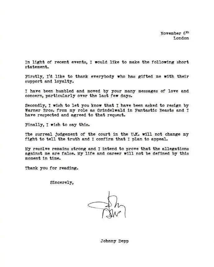 而后,华纳兄弟公司声明将解雇德普,取消其在《神奇动物在哪里3》中的戏份,迪士尼也发表声明,将不再准许德普出演《加勒比海盗》。