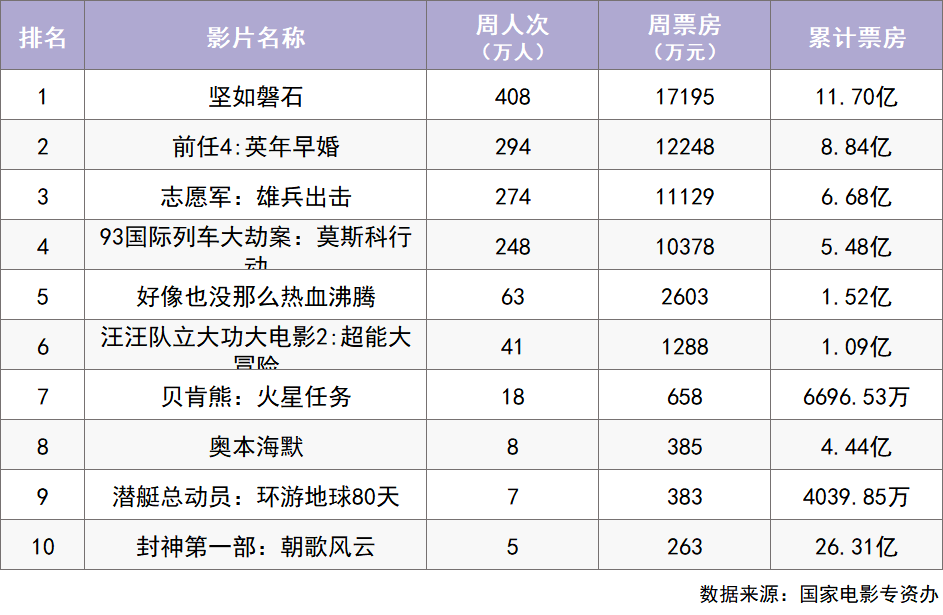 上周票房前三名分别是《坚如磐石》《前任4:英年早婚》以及《志愿军:雄兵出击》,基本保持着上上周的大盘格局。不过,这些影片的周票房均未突破两亿元。