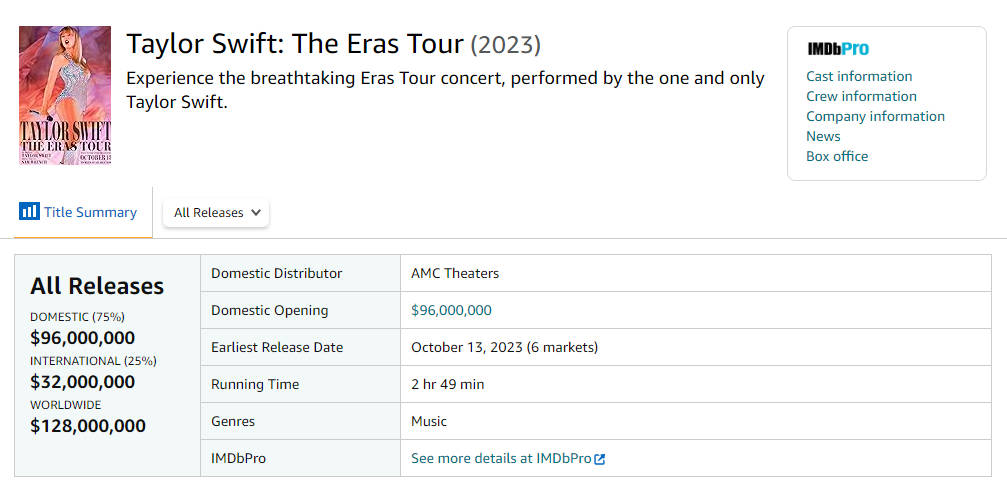 1. 《泰勒·斯威夫特:时代巡回演唱会》(9500万美元 )(上映中)