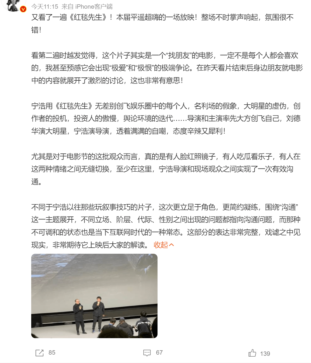 某知名博主发文表示已经二刷,现场不时掌声响起,氛围很不错。他认为《红毯先生》不同于宁浩以往那些叙事技巧的片子,这次更立足角色,更简约凝练、围绕“沟通”这一主题展开,不同立场、阶层、代际、性别之间出现的问题都指向沟通问题。