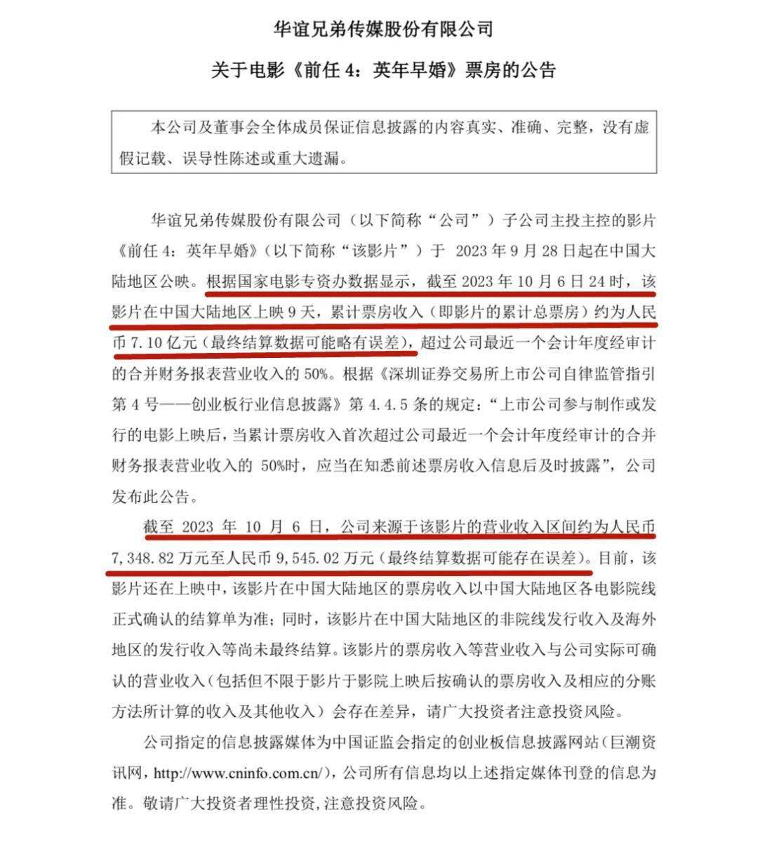 根据华谊兄弟票房公告显示,截至 2023 年 10 月 6 日24时,《前任4:英年早婚》累计票房约为7.1亿元,公司来源于该影片的营业收入区间约为人民币7348.82万元至人民币9545.02万元。按此数据计算,该片票房营收回报率约为10.3%至13.4%。