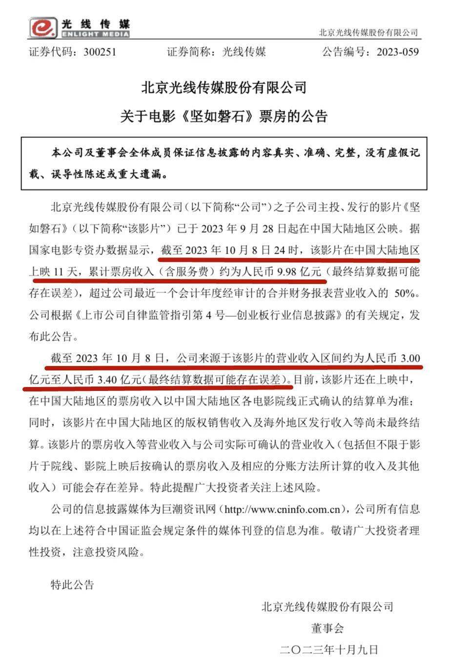 根据光线传媒发布的票房公告显示,截至 2023 年 10 月 8 日24时,《坚如磐石》累计票房约为9.98亿元,公司来源于该影片的营业收入区间约为人民币3亿元至人民币3.4亿元。按此数据计算,光线传媒关于此片的票房营收回报率约为30.06%至34.06%。