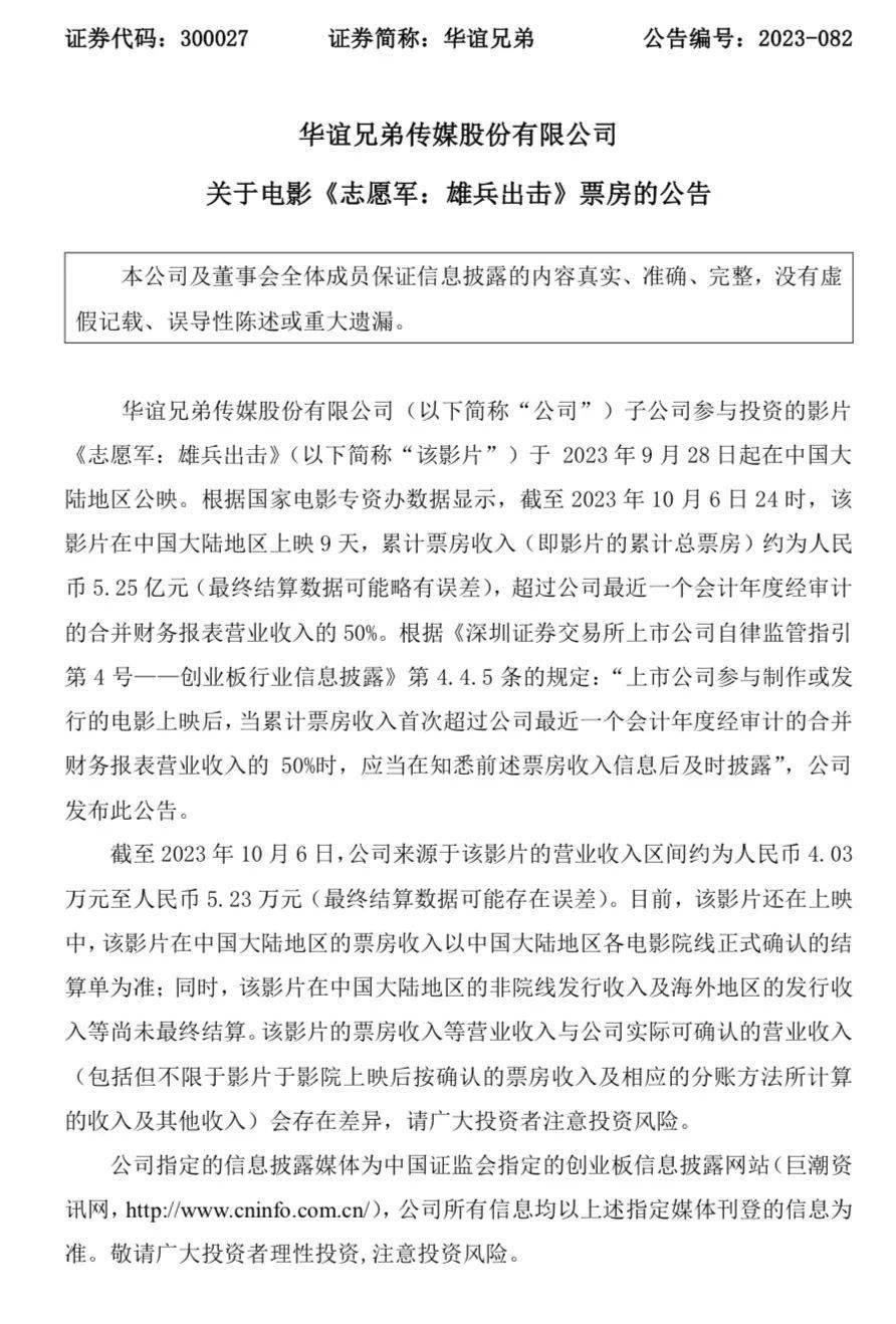 2023年国庆档,《志愿军:雄兵出击》上映9天票房累计收入约为人民币5.25亿元时,华谊兄弟源于该片的营收区间为4.03万元至5.03万元。根据公开信息显示,华谊兄弟是本片第一联合出品方。