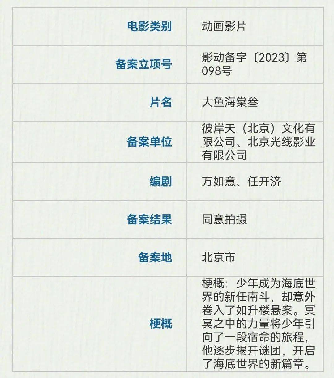 据国家电影局关于2023年8月下全国电影剧本(梗概)备案、立项公示的通知,动画电影《大鱼海棠3》正式备案立项。《大鱼海棠》2016年7月上映,《大鱼海棠2》2021年备案立项。《大鱼海棠3》讲述少年成为海底世界的新任南斗,却意外卷入了如升楼悬案。冥冥之中的力量将少年引向了一段宿命的旅程,他逐步揭开谜团,开启了海底世界的新篇章。