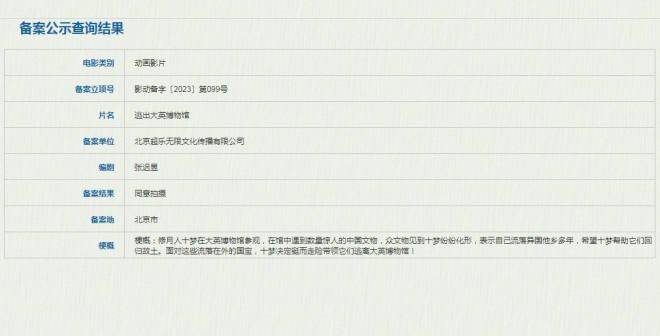 1905电影网讯10月13日,据国家电影局发布关于2023年8月上全国电影剧本(梗概)备案、立项公示的通知,电影导演担任编剧的新作,动画电影《逃出大英博物馆》官宣立项,备案单位为北京超乐无限文化传播有限公司。