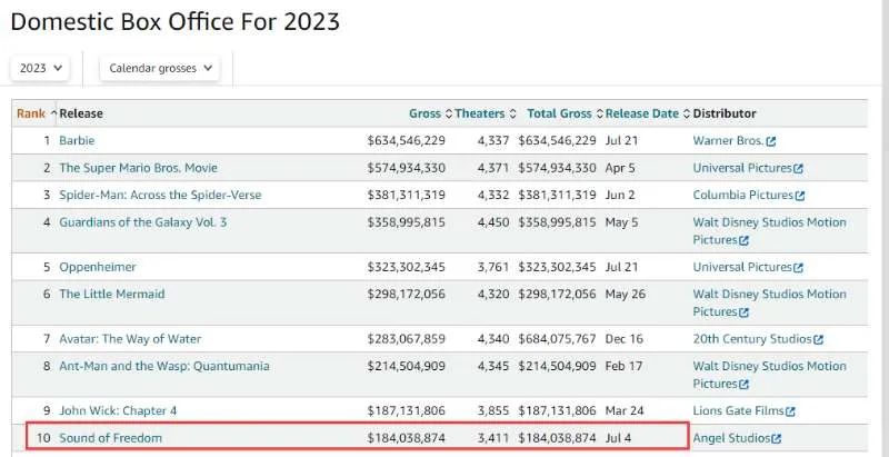 今年暑期档,一部制片成本仅1400万美元的天主教独立电影——《自由之声》(Sound of Freedom)横空出世,在北美本土取得1.84亿美元的票房成绩,挤进2023年度北美票房前十,引起行业惊诧。