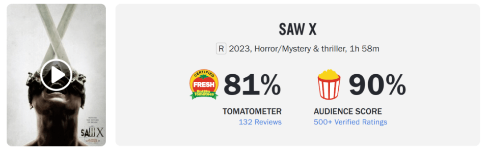 从口碑来看,《电锯惊魂10》在烂番茄网站上拿到81%的“新鲜”认证,主流媒体盛赞托宾·贝尔的表演堪称系列最佳,并表示“与所有血腥内容相配的是令人惊讶的用心”,为这个恐怖片的金字招牌注入了新的活力;同时《电锯惊魂10》也博得91%的观众好感度,显示粉丝对最新作也相当满意。