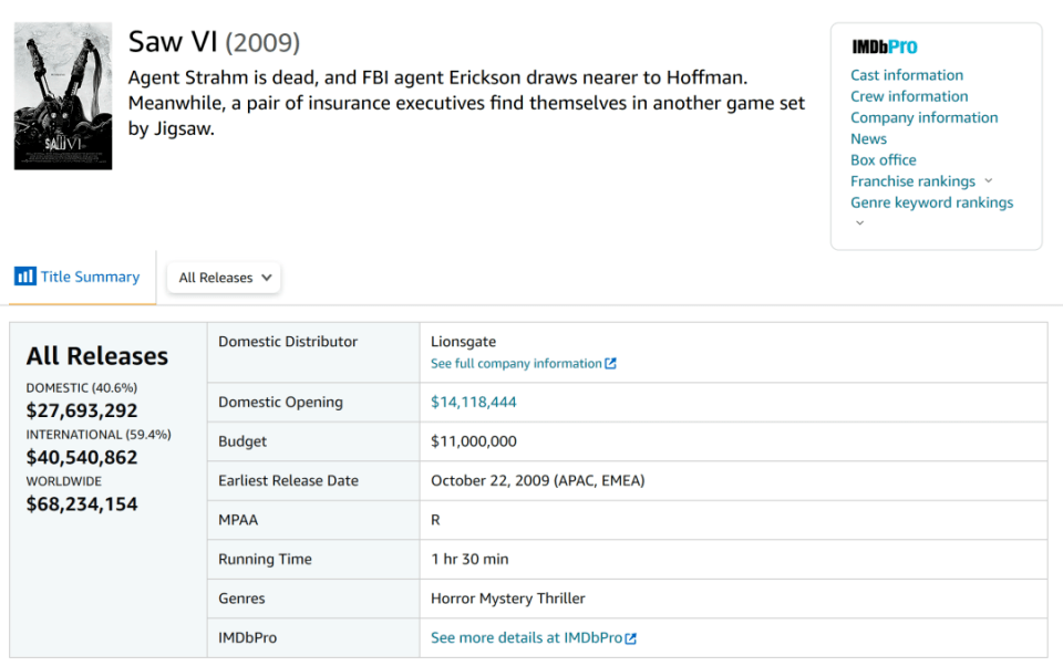 不过2009年的《电锯惊魂6》成为转折点,北美收益大幅下滑至2769万美元,全球更首次掉到1亿美元之下;即便投资回报比依旧超过6倍,但这一系列明显已触及天花板。
