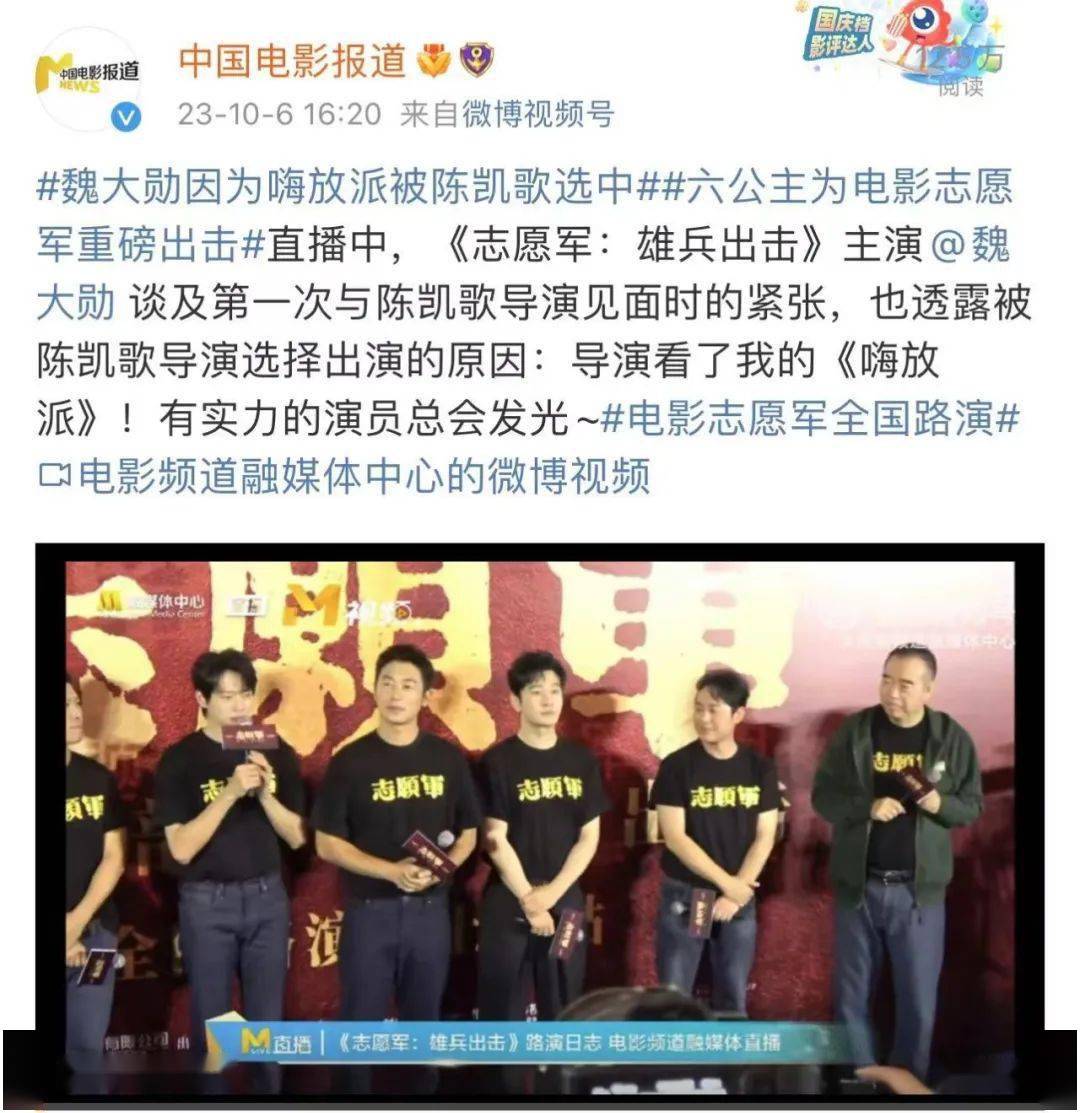 《志愿军:雄兵出击》则主打“干货满满”,比如“魏大勋因为嗨放派被陈凯歌选中”“陈飞宇说魏大勋第一场戏紧张到疯狂喝水”“张颂文用25年从陈凯歌的观众变演员”等不为人知的影片幕后都在路演及直播中曝光,引发网友热议。