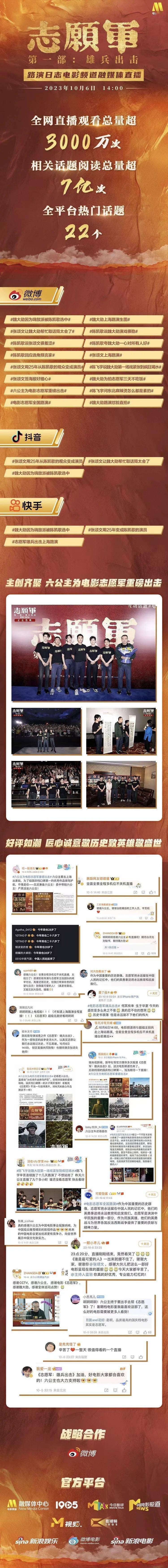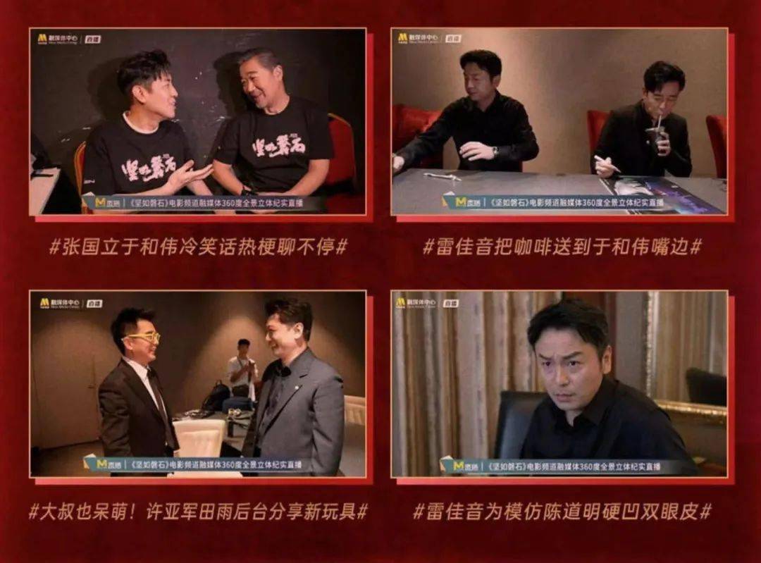 直播中《坚如磐石》主演雷佳音在酒店喝着“人参水”养生,一路边走边聊,首映结束后前来观影的张艺兴和演员王迅偶遇拥抱,《志愿军:雄兵出击》导演陈凯歌“翻包”挑战,张颂文签海报好细心等独家内容和互动都令大家印象深刻。