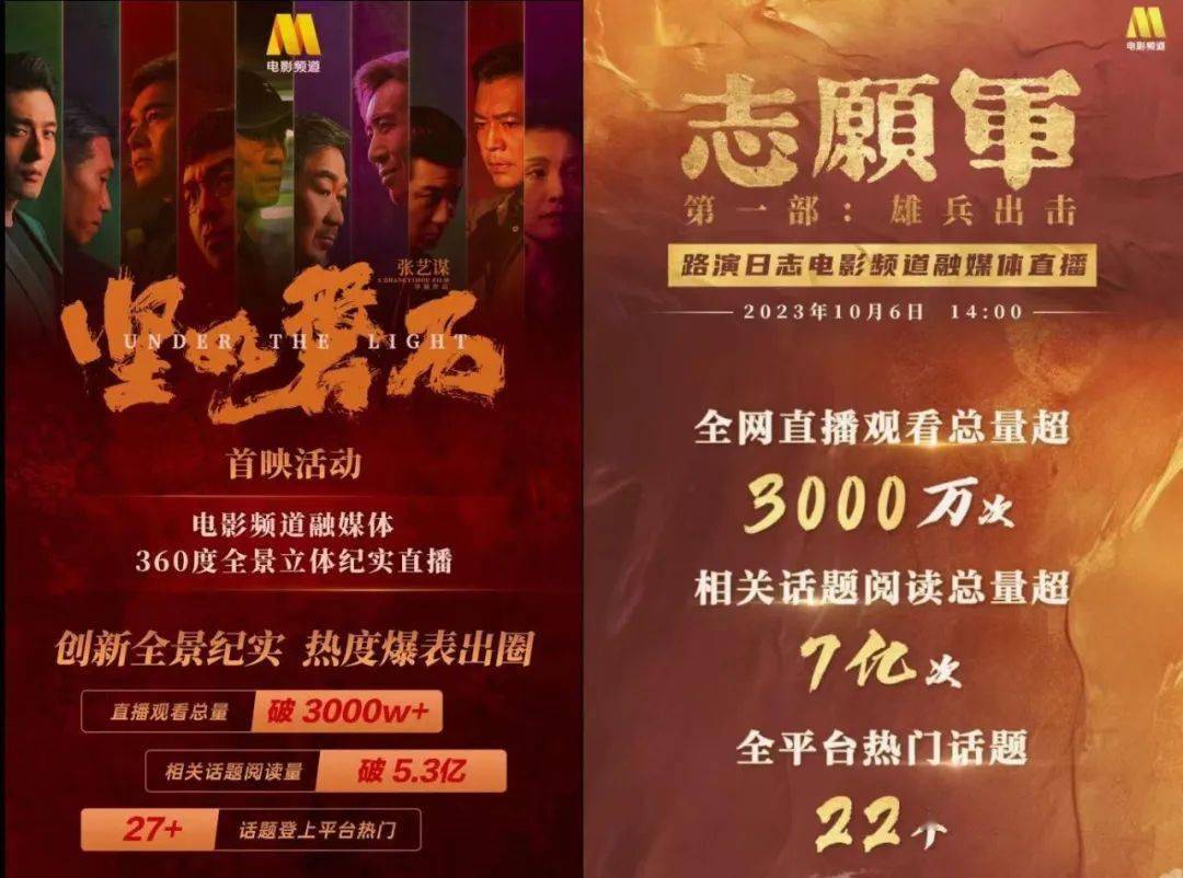 与此同时,电影频道也从暑期档《封神第一部》的成功经验出发,对国庆档四部大片继续进行了“全景式纪实直播”,在全面、全景、全程直播首映礼、路演台前幕后,独家对谈电影核心主创的同时,借助新媒体矩阵进行分发传播,打造爆款话题,线上线下联动打出了一副营销“组合牌”。