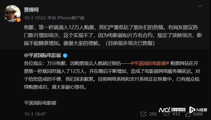多部重磅级影片会在本届平遥国际影展展映,影迷们在10月3日下午陷入了一轮抢票大战。据创始人贾樟柯在微博的说法:“第一秒就涌入12万人购票,我们严重低估了朋友们的热情。有网友提议热门影片增加场次,这个实现不了,因为电影展和片方有合约,规定了放映场次,影展不能随意增加。谢谢大家的理解。(目前很多场次已售罄)”