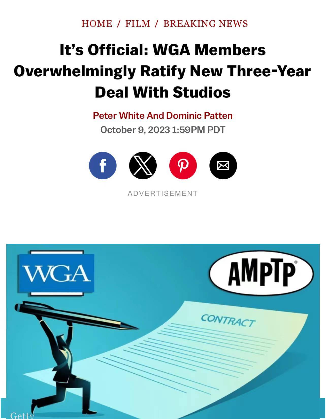 此次投票在WGA内部举行,为期一个星期,最终8525个有效投票以8435票赞同、90票反对的压倒性优势通过这份新的合约。新合约期限为从今年9月25日到2026年5月31日,涉及包括备受关注的编剧增益补偿、新增对电视编剧室的最少雇员标准要求、针对编剧的改善报酬条款、对AI在编剧过程中使用的防护等。