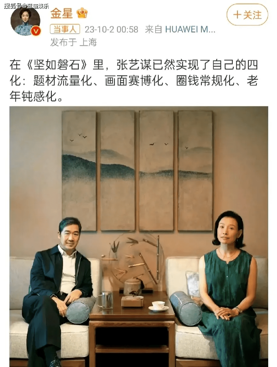 在这篇文章中,金星以她独特的辛辣风格,直接指出张艺谋近期执导的电影《坚如磐石》已经实现了所谓的“四化”。这四化分别是:题材流量化、画面赛博化、圈钱常规化、老年钝感化。
