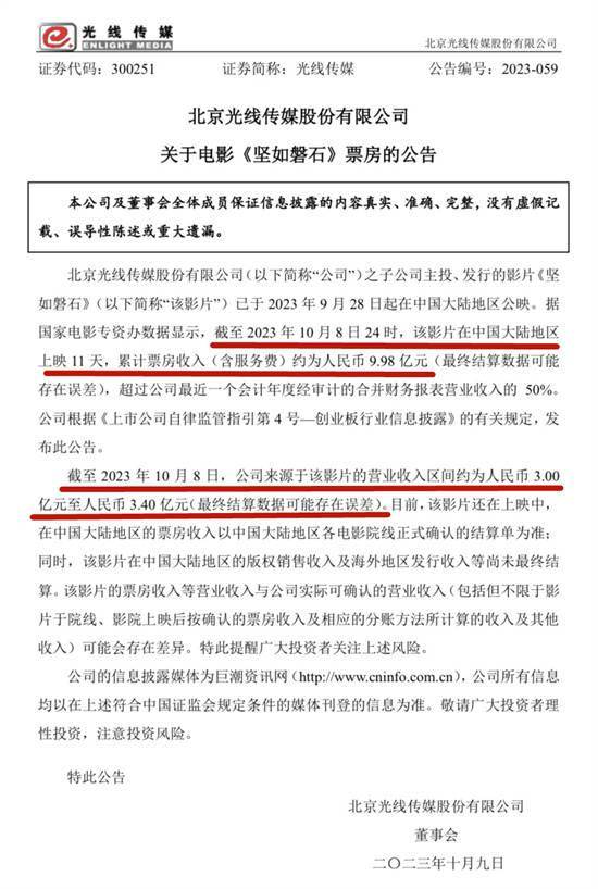 原标题:光线传媒发布票房公告 《坚如磐石》营收超3亿