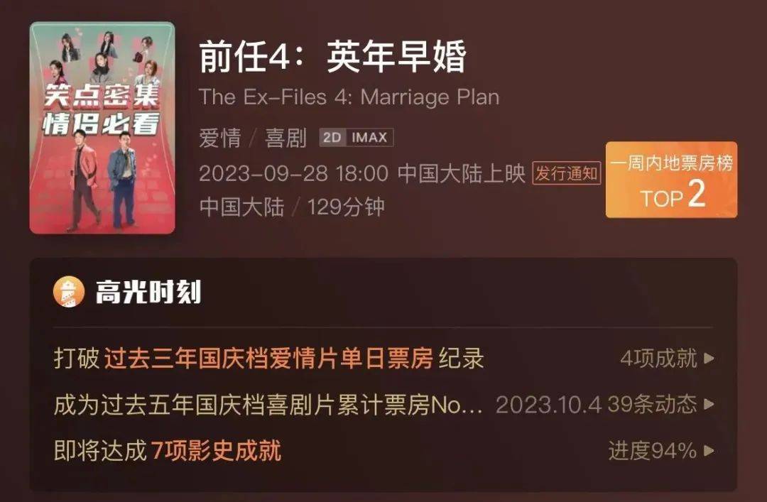 六年后,《前任4》来了,一如《前任3》“气势汹汹”。上映当天,《前任4》拿下票房、观影人次、上座率、预售四项日冠,成为单日电影大满贯得主,甚至豆瓣开分6.8,超过了同档期张艺谋导演的《坚如磐石》,也高于前三部的评分。