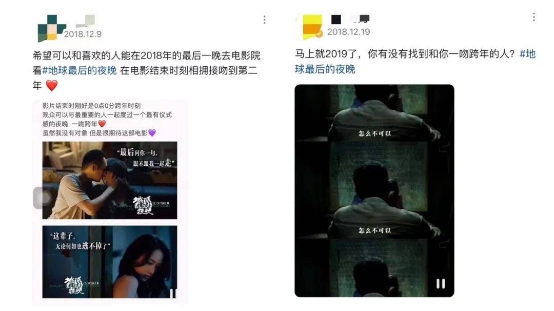 之后2018年《地球上最后的夜晚》再次证明了短视频的潜力,一条“2018年最后一晚去电影院和喜欢人一起看《地球最后的夜晚》”的备忘录在抖音突然火起来,宣发团队在抖音平台开展“一吻跨年”营销活动,大量用户被营销的观影仪式感带动,纷纷购票,电影上映首日票房就破2亿,票房占比达到了50.8%,这对于一部文艺片来说,堪称奇迹。