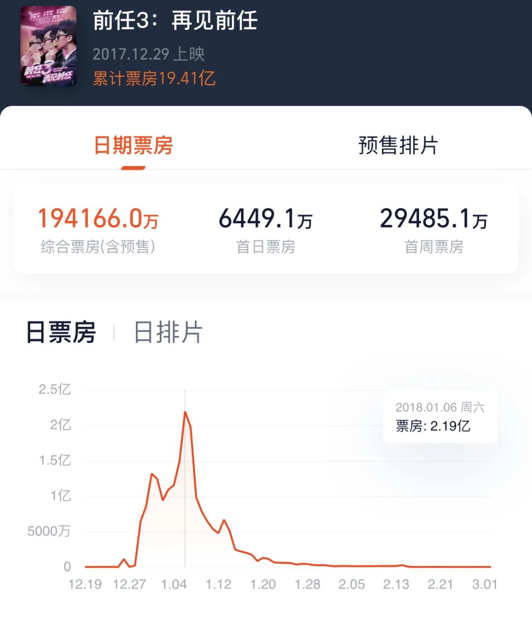 就是这种情绪引起了大众强烈共鸣,带动票房持续走高。在贺岁档,《前任3》以1.6%的排片开局,经过3次票房逆跌,票房一路高涨,单日票房最高达2.03亿,连续多日票房占比超50%,同档期《妖猫传》《解忧杂货店》根本无力抗争,《前任3》的凶猛势头一直持续到2018年情人节档,最终拿下19.4亿票房。