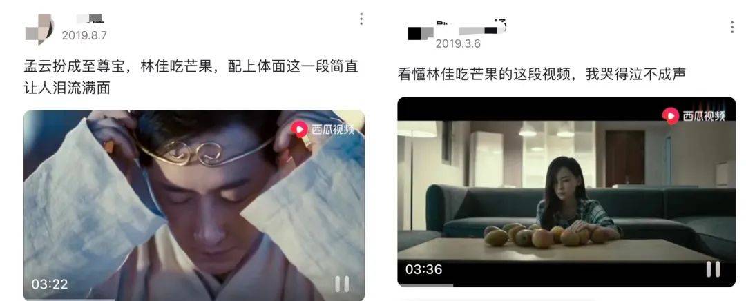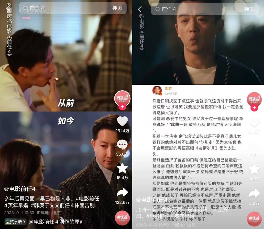 片中,余飞哭着吹《友情岁月》口哨段落是电影高潮,但远不及“至尊宝”、“吃芒果”桥段情绪浓度高。《前任4》官抖账号里,点赞最高的是“孟云林佳久别重逢”,有251.4万点赞,而“余飞吹口哨”只有10万点赞。