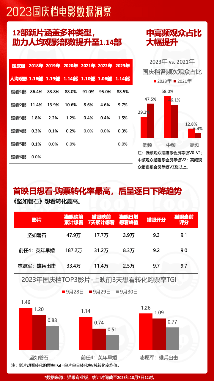 充分的可选性推动了国庆档人均观影部数提升,达到了1.14部,较2021年的1.10部与2022年的1.06部有显著提升,在此之中,观影热情相对更高的中高频用户占比也有明显提升。