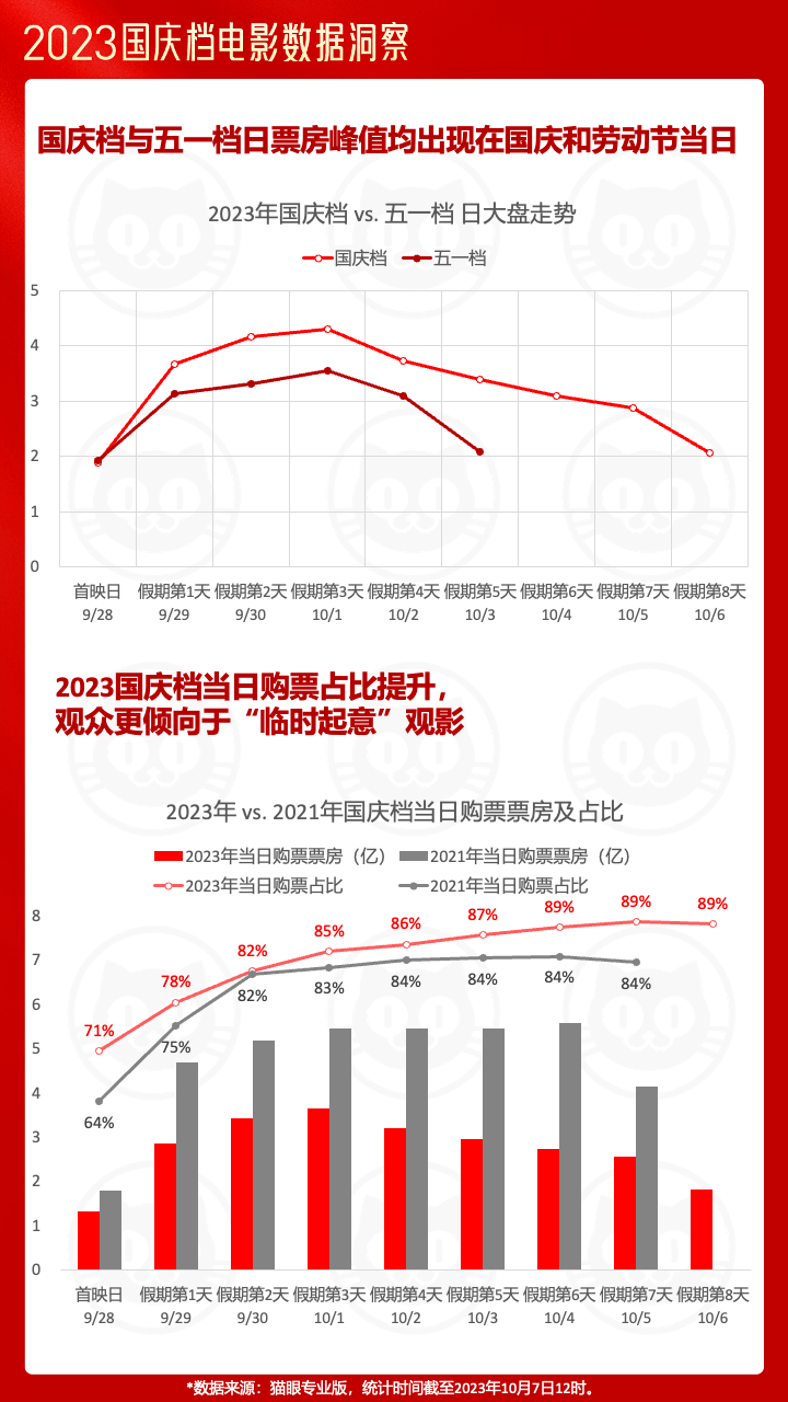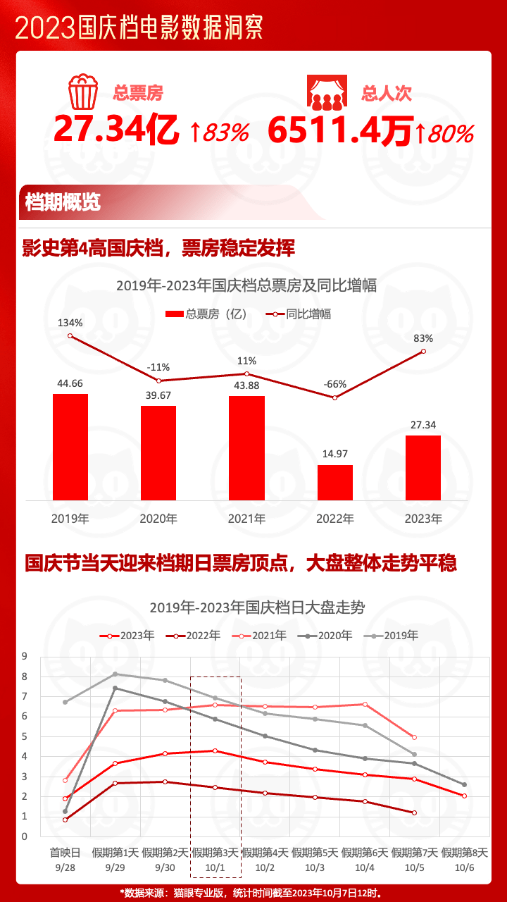 10月7日,猫眼研究院联合微博电影发布了《2023国庆档电影数据洞察报告》(以下简称《报告》),据显示,今年国庆档总票房达27.34亿元,总观影人次超6511.4万,二者较去年同期均上涨超80%。这个票房成绩仅次于2019年-2021年国庆档,为影史第四高。