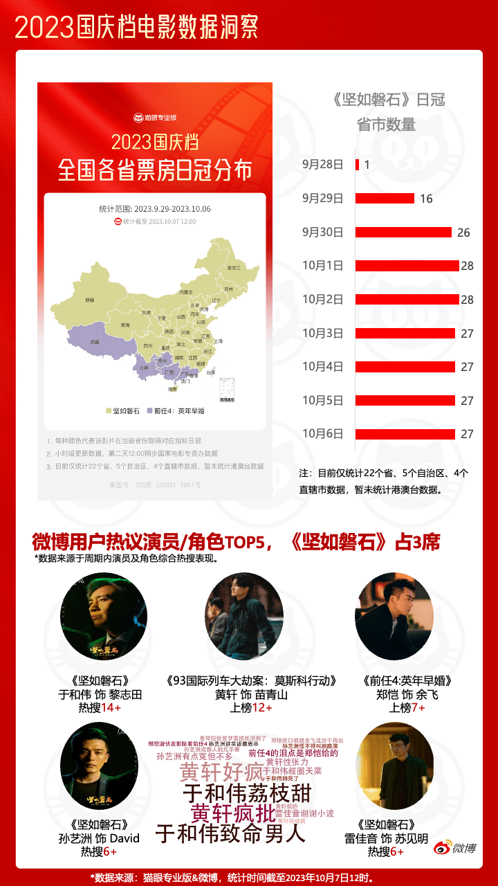 值得一提的是,今年国庆档张艺谋、陈凯歌两位第五代导演的首次强强相遇也收获了全民关注。在国庆档影片宣发期间,《坚如磐石》《志愿军:雄兵出击》的主创提及率第一均为影片导演。这也为未来更多影片的宣发侧重点提供了一定参考思路。
