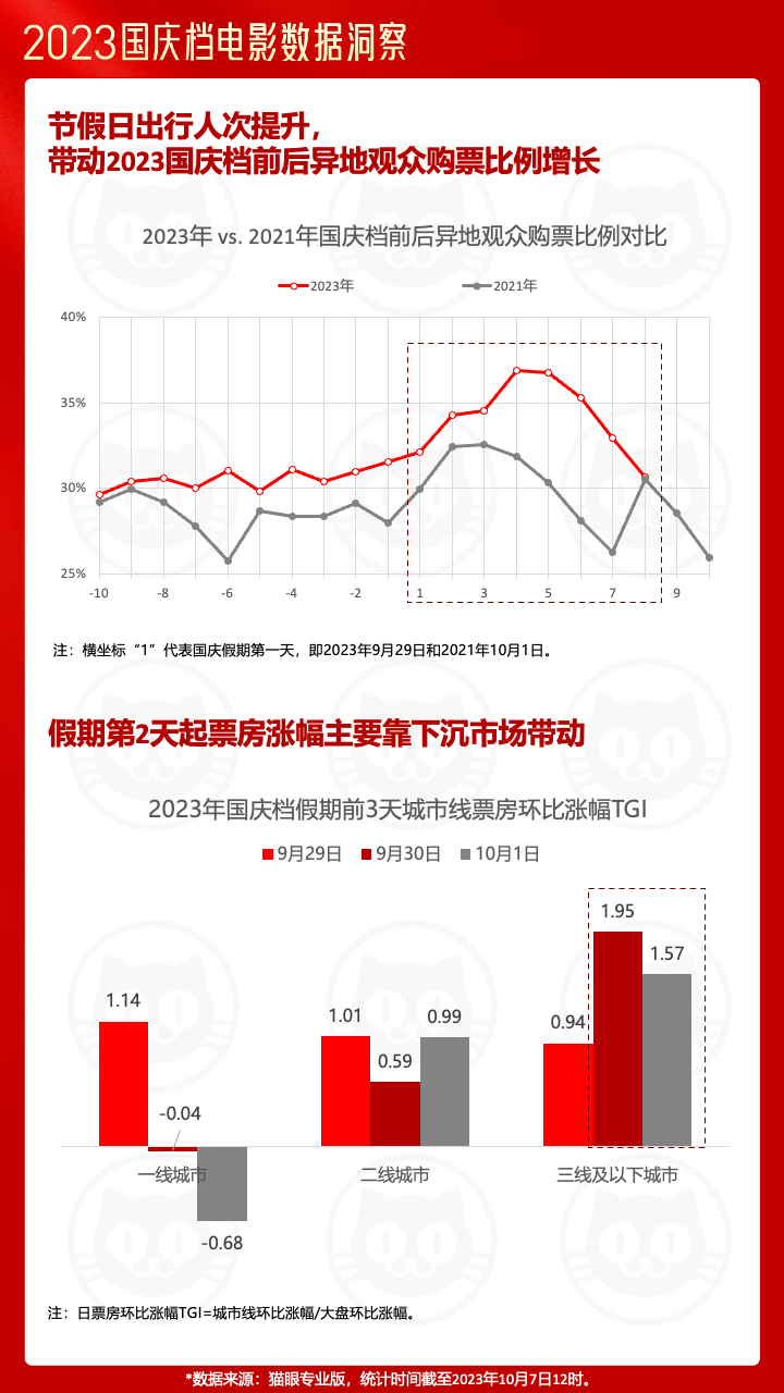 与此同时,今年以来国内旅游市场的繁荣复苏,也并未阻止观众的观影兴致,这直观体现在了今年国庆档前后异地观众购票比例的显著性增长。在分线城市表现上,下沉市场的票房产出能力也依旧可观,成为了今年国庆档票房贡献的最大功臣。