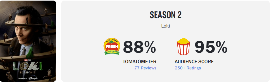 目前,《洛基2》烂番茄新鲜度为88%,低于前作的92%,豆瓣开分8.8也低于第一季,可以感受到大家对它的新鲜感有所降低。