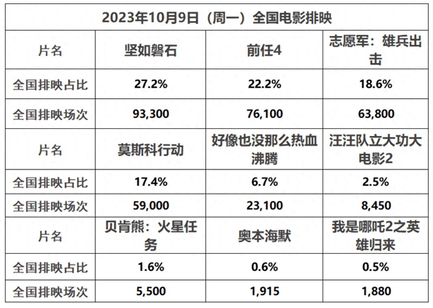 周一常规工作日市场排映情况:《坚若磐石》单日占比小幅升至27.2%,仍以绝对优势居冠;《前任4:英年早婚》排映占比小幅回升至22.2%左右,《志愿军:雄兵出击》单日占比小跌至18.6%,两片差距继续扩大。《莫斯科行动》单日占比进一步升至17.4%左右,再创开画以来的新高;而《好像没有那么热血沸腾》占比基本维持不变。
